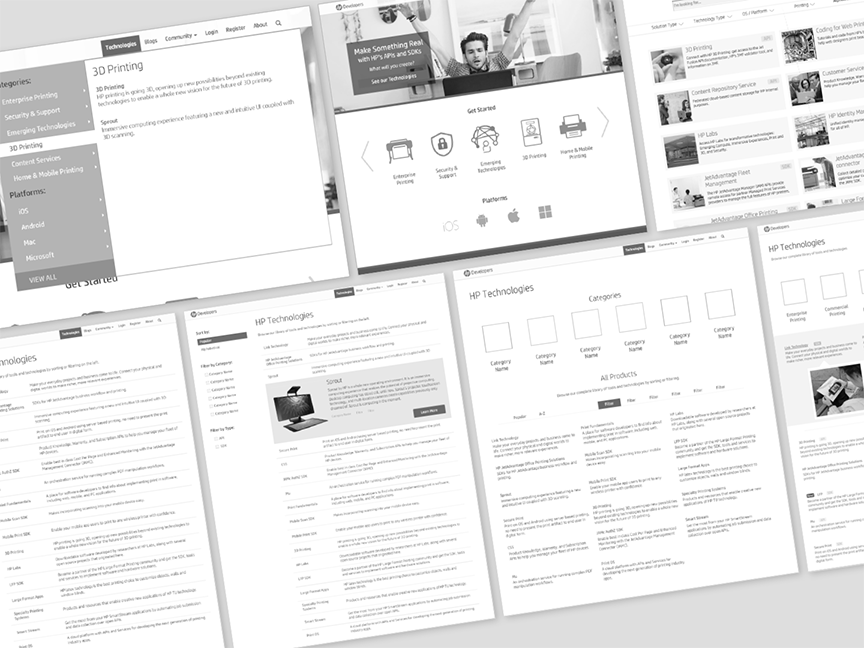 As the Lead UX/UI Designer for HP’s Developer Portal, I was responsible for driving the end-to-end research and design process. This included conducting user research, facilitating ideation sessions, gathering feedback through testing, and developing low- to high-fidelity prototypes. I worked in close collaboration with the development team in Lean UX cycles to ensure alignment between design and implementation, and I also contributed front-end code changes within the Drupal environment to support the design vision.